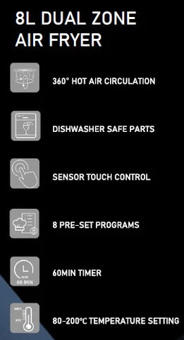 SYNC COOK - Set each basket to cook different foods and then Press the SYNC option to finish foods at the same time.